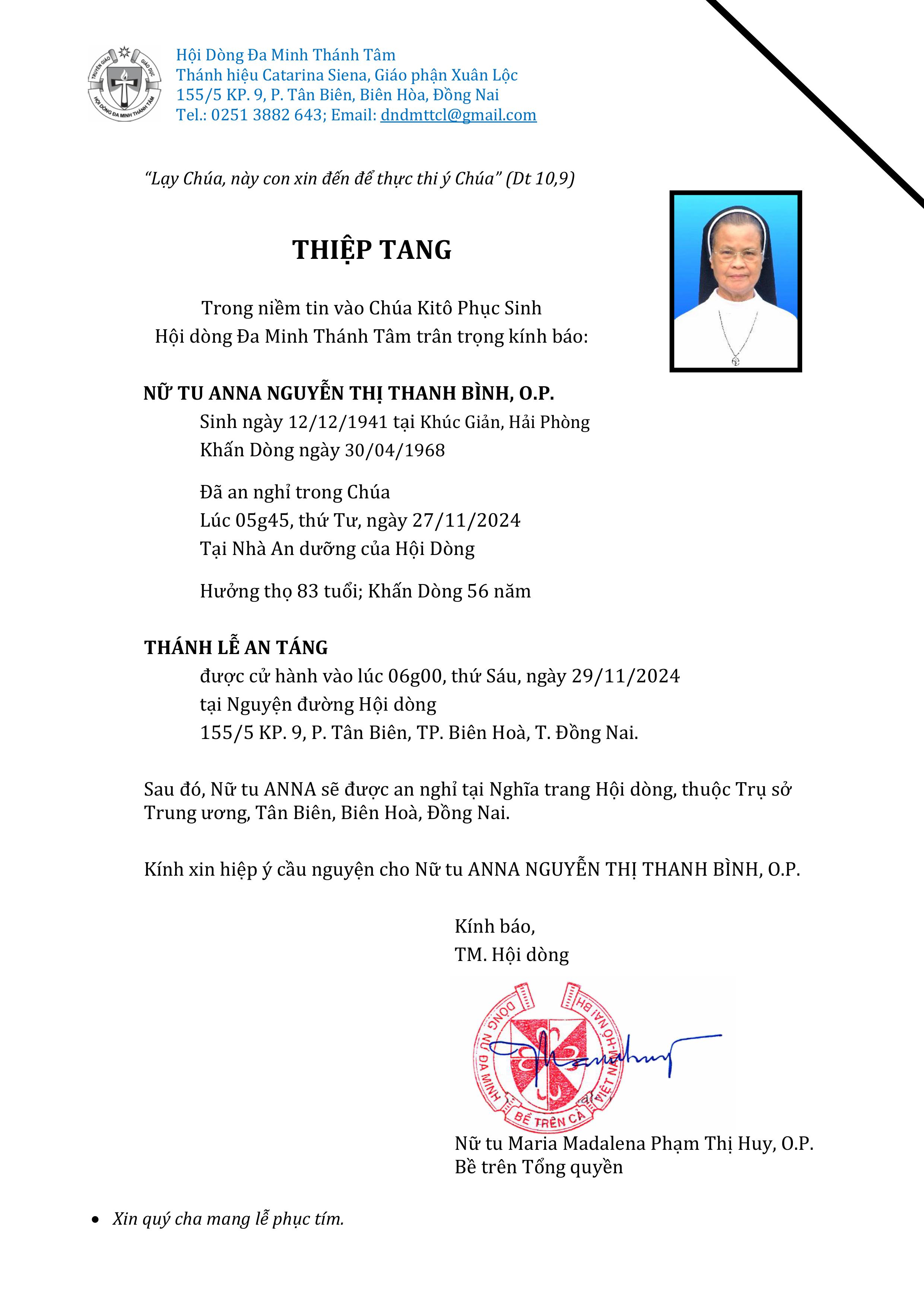 Thánh lễ An táng cho Dì Anna sẽ được cử hành vào lúc 06g00 thứ Sáu, ngày 29.11.2024 tại Nguyện đường Hội dòng Đaminh Thánh Tâm, Giáo hạt Hố Nai.