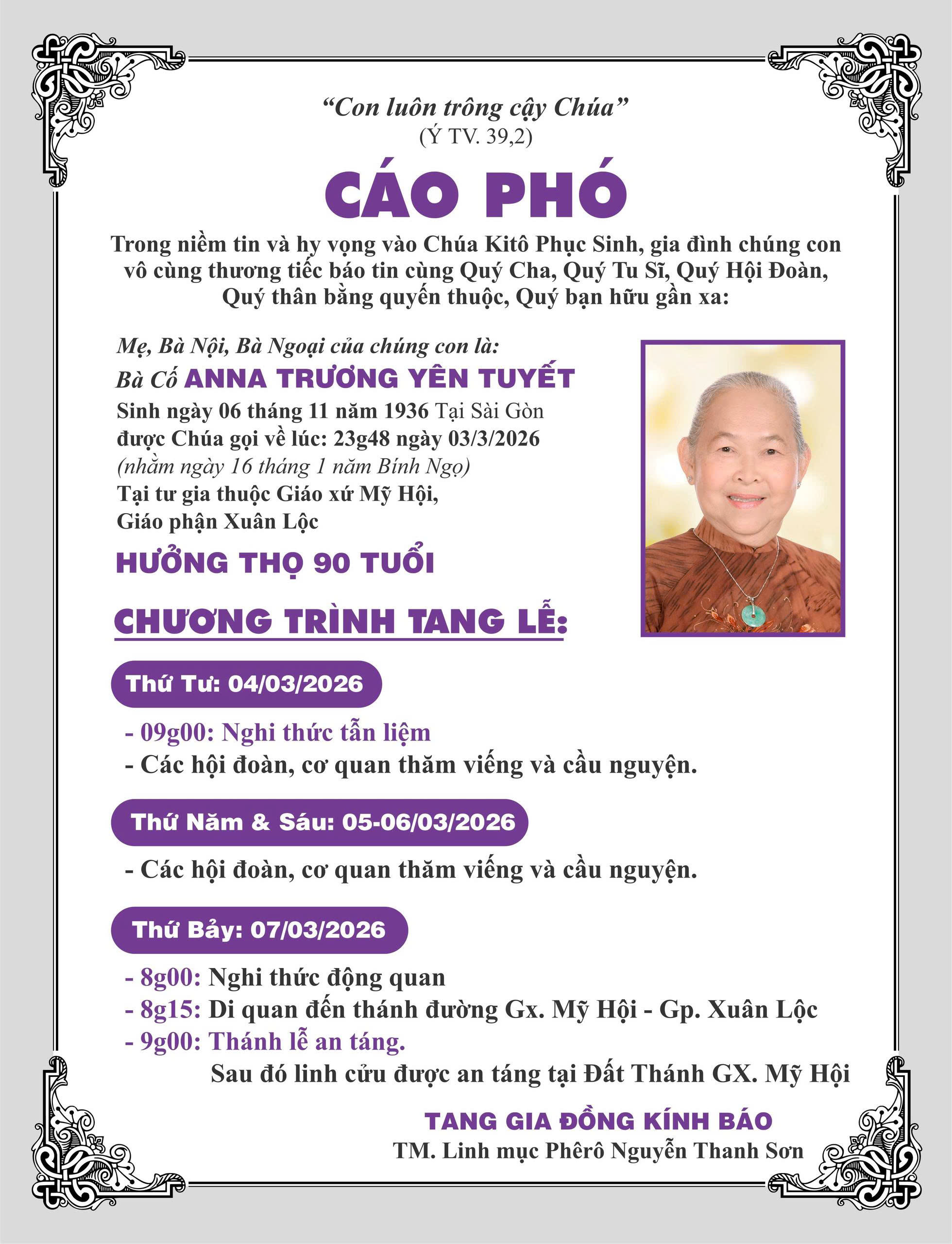 Thánh lễ An táng cho Bà Cố Anna sẽ được cử hành tại Thánh Đường Giáo xứ Mỹ Hội, Giáo hạt Phước Lý lúc 09g00 thứ Bảy, ngày 07.03.2026.
