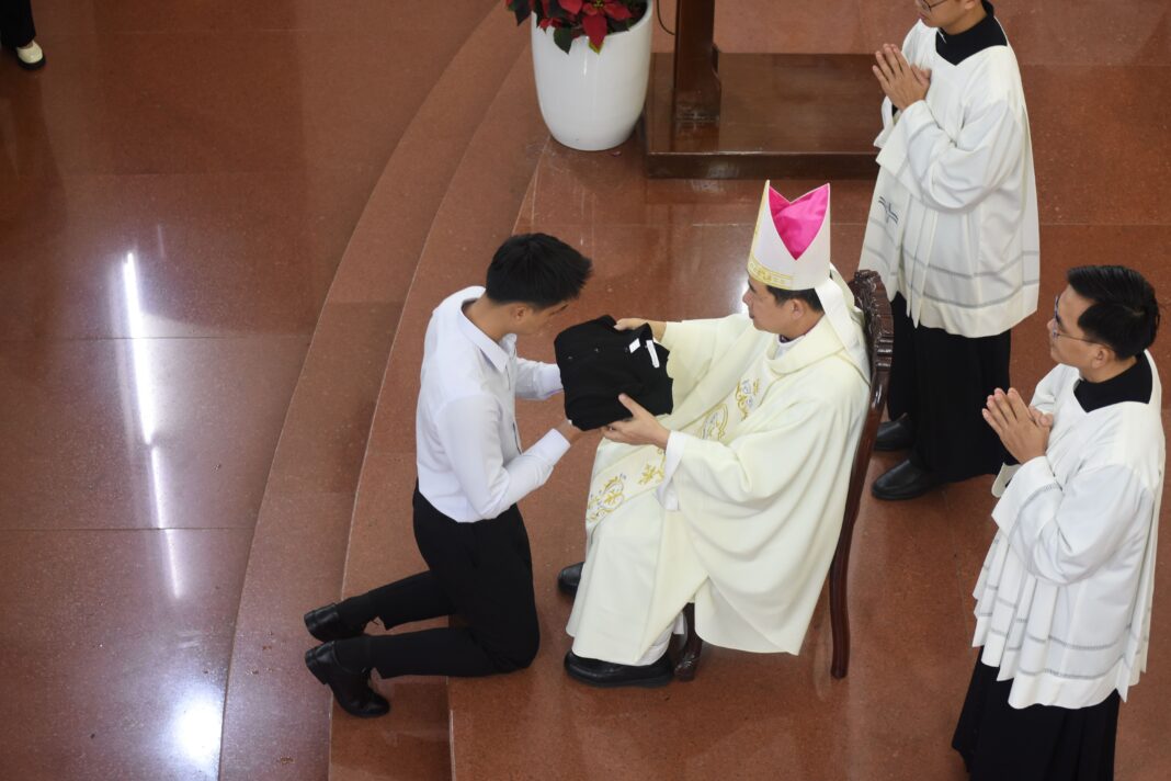 Sau lời huấn từ, Đức Cha đã làm phép và trao tu phục cho 41 anh em. Nghi thức diễn tả những anh em này được thẩm quyền của Hội Thánh nhận vào hành trình tu luyện tiến tới chức linh mục, đồng thời, nói lên sự tự nguyện đáp trả của anh em trước tiếng mời gọi yêu thương của Thiên Chúa, để từ đây dấn bước theo Chúa Giêsu Kitô – Vị Mục Tử Nhân Lành – Đấng đã yêu thương kêu gọi anh em.