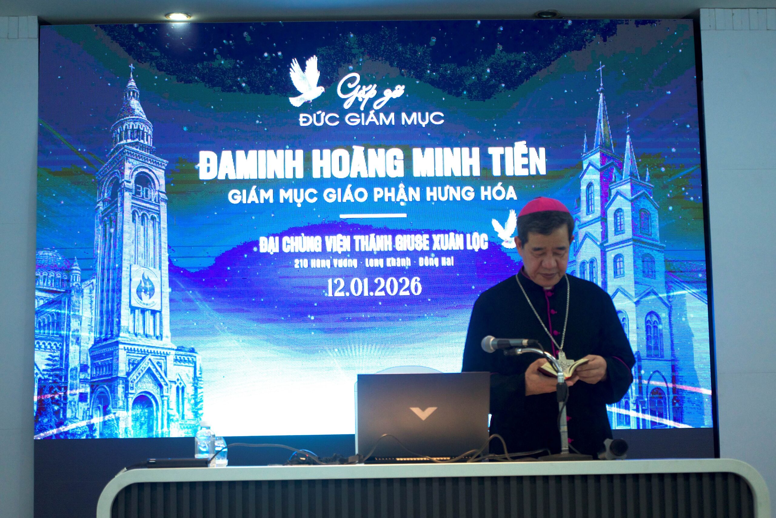 Vào lúc 16h50’ thứ Hai, ngày 12 tháng 01 năm 2026, Đại Chủng viện Thánh Giuse Xuân Lộc hân hoan chào đón Đức cha Đaminh Hoàng Minh Tiến – Giám mục Giáo phận Hưng Hoá đến thăm và huấn đức. Hiện diện trong buổi gặp gỡ có Cha Tổng linh hướng Giuse, quý Cha giáo, cùng 381 Chủng sinh đến từ 9 giáo phận. Đây là một cơ hội quý báu để anh em chủng sinh lắng nghe những tâm tư, thao thức cũng như những chia sẻ của Đức Cha Đaminh về “Sự Trung Tín Trong Ơn Gọi”, dựa trên Tông thư “Sự Trung Tín Tạo Nên Tương Lai” của Đức Thánh Cha Lêô XIV.