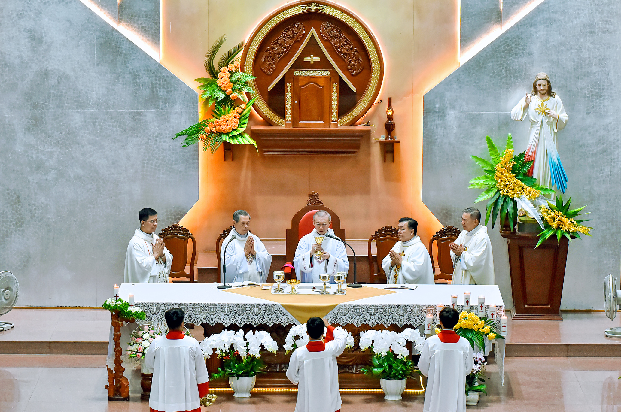 Đỉnh cao của ngày hồng phúc là Thánh lễ Tạ ơn tại ngôi thánh đường khang trang. Khởi đi từ tâm tình của bài ca nhập lễ: "Ví như Chúa chẳng xây nhà, thợ nề vất vả cũng là uổng công" (Tv 127), Đức Cha chủ tế nhấn mạnh rằng mọi ơn huệ và thành công của giáo xứ đều đến từ sự quan phòng của Thiên Chúa, qua sự nỗ lực góp công góp của của mọi thành phần Dân Chúa mà hoàn thành.