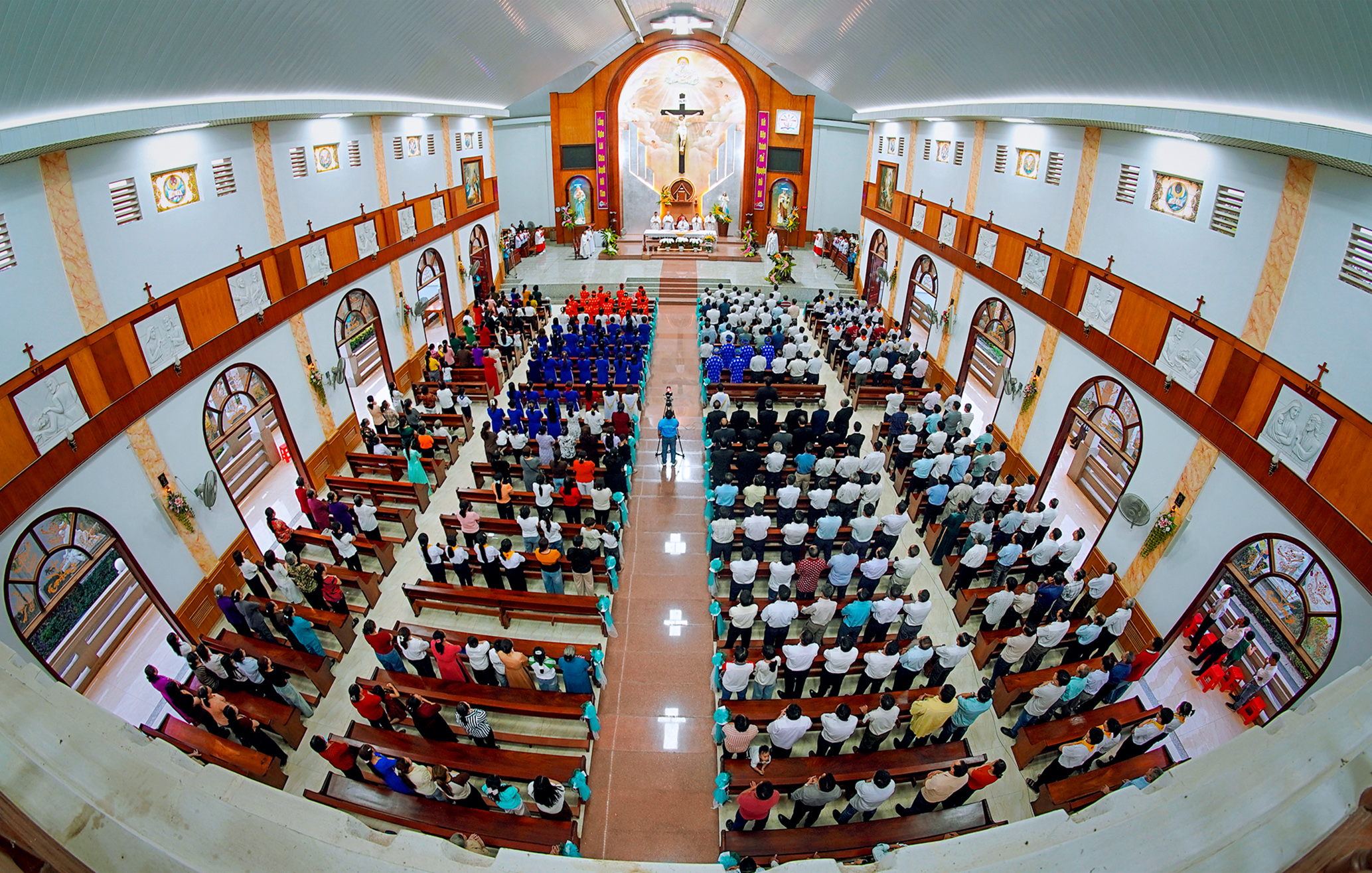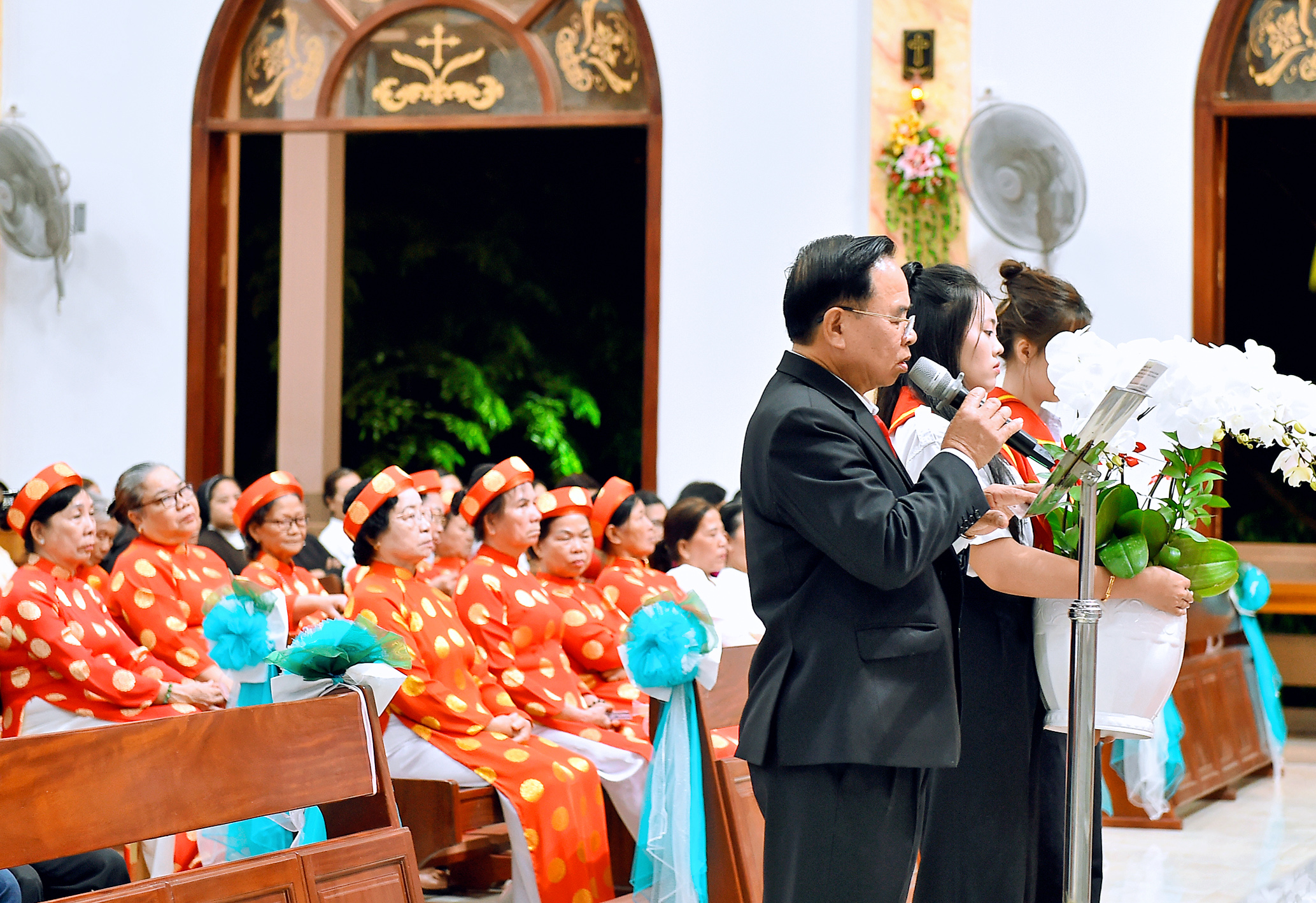 Đoàn rước khởi hành từ sân trước nhà giáo lý tiến vào thánh đường với sự tham gia đầy đủ của các giới: từ thiếu nhi, giới trẻ, giáo lý viên đến các hội đoàn hiền mẫu, gia trưởng và cao niên.
