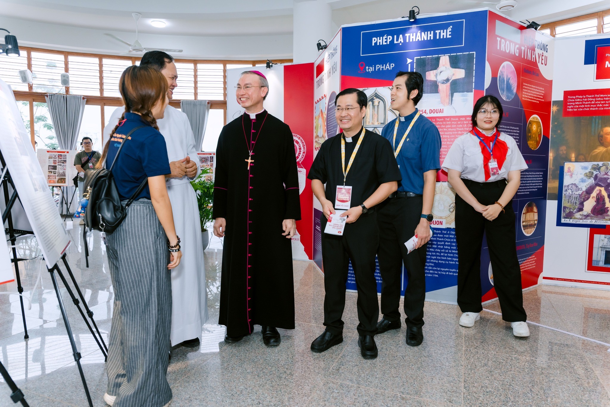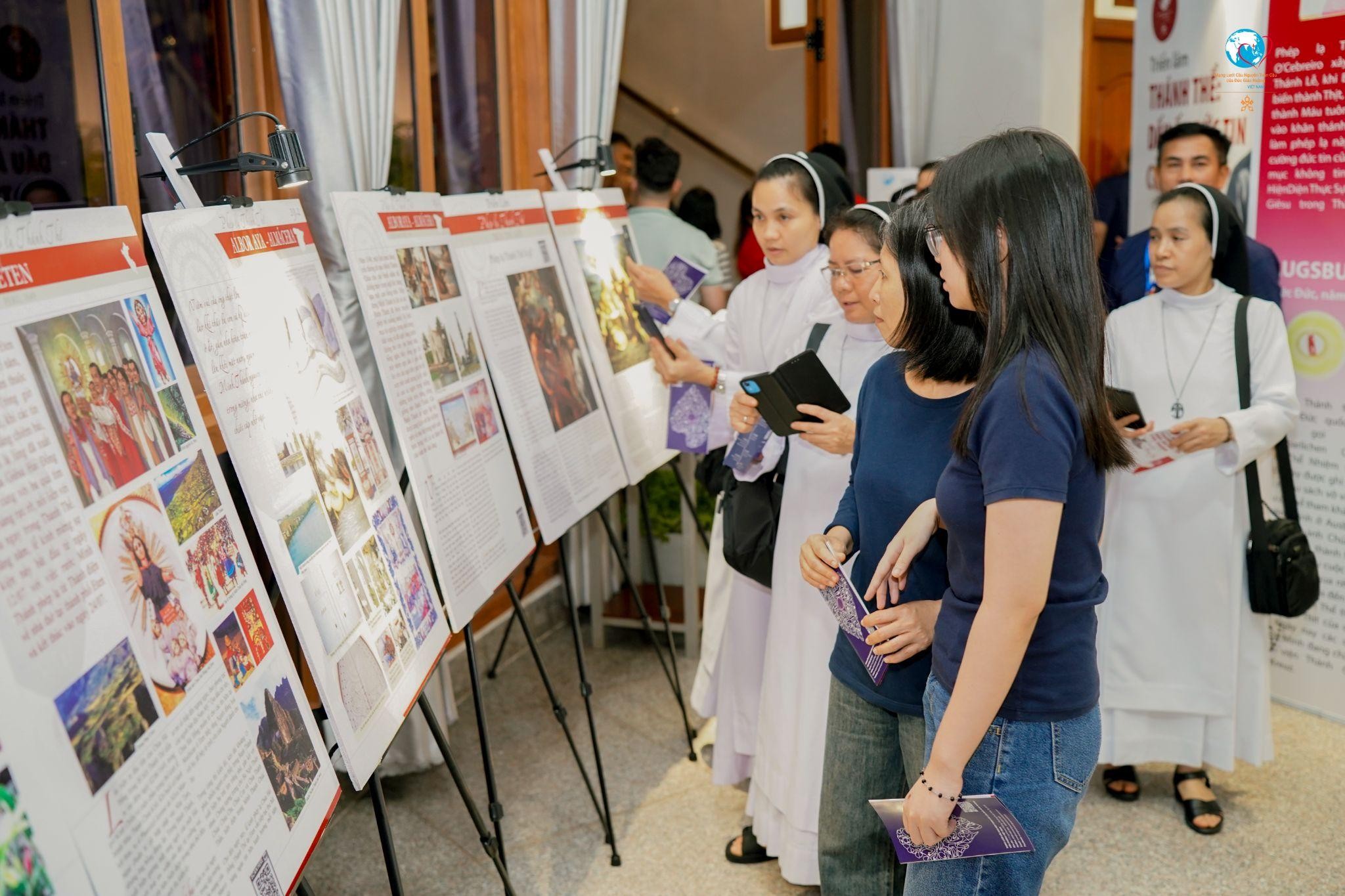 Sau nghi thức khai mạc, Đức Cha Đaminh đã cùng Cha Tôma Vũ Ngọc Tín, SJ, Cha Giuse Bùi Tuấn Phong, quý cha và cộng đoàn tham quan không gian triển lãm – nơi trưng bày các câu chuyện về Phép lạ Thánh Thể được Giáo Hội công nhận trên khắp thế giới, được Thánh Carlo Acutis sưu tầm và hệ thống hóa trong suốt cuộc đời ngắn ngủi nhưng rực sáng của ngài.