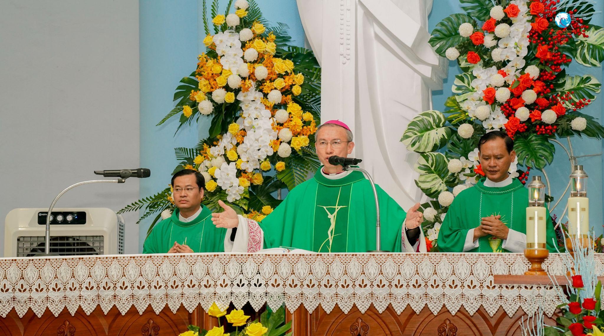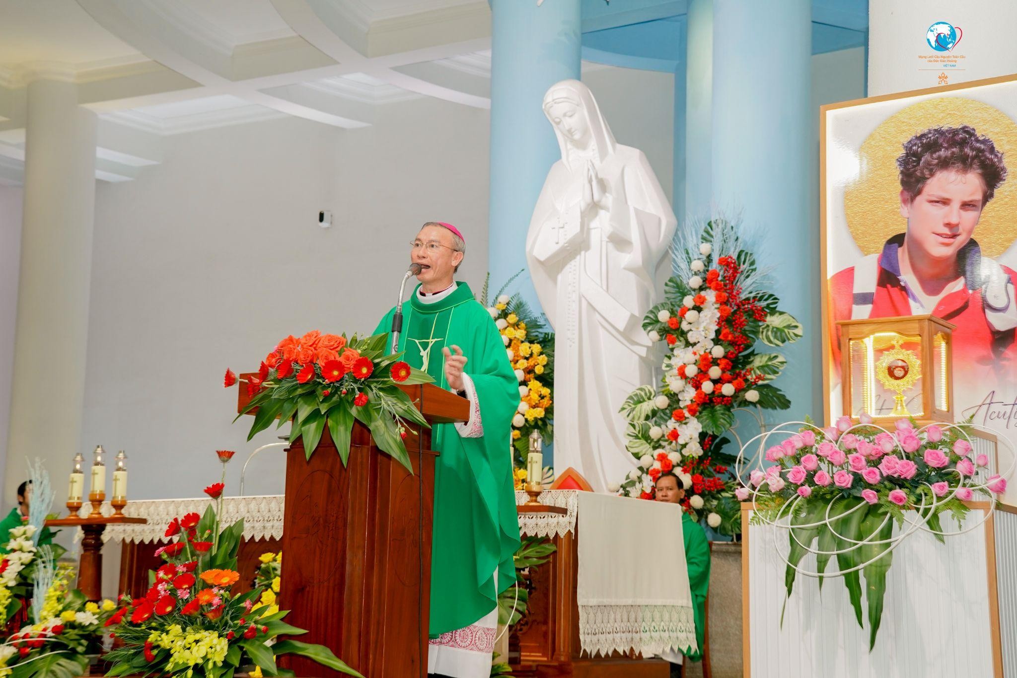 Đỉnh cao của buổi chiều sốt mến là Thánh lễ khai mạc được cử hành trọng thể do Đức Cha Đaminh Nguyễn Tuấn Anh chủ tế. Trong bài giảng, Đức Cha chia sẻ về hình ảnh Thánh Carlo Acutis – con người của cầu nguyện. Vị Thánh trẻ đã để lại cho thế giới một chứng tá thật đơn sơ nhưng sâu sắc: “Cầu nguyện là trung tâm của đời sống.” Ngài yêu mến Chúa Giêsu Thánh Thể, siêng năng lần chuỗi Mân Côi, và sống tinh thần kết hiệp mật thiết với Chúa trong từng việc nhỏ bé hằng ngày.