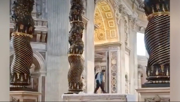 Một số video cho thấy anh ta nhảy lên bàn thờ chính của Vương cung thánh đường Thánh Phêrô và đạp đổ sáu chiếc chân đèn quý giá trước khi xé tấm khăn trải bàn thờ màu trắng: một người đàn ông gốc Rumani, đeo ba lô, đã bị hiến binh Vatican bắt vào thứ Sáu ngày 7 tháng Hai khi anh ta đang tìm cách phá hoại bàn thờ của vương cung thánh đường Thánh Phêrô.