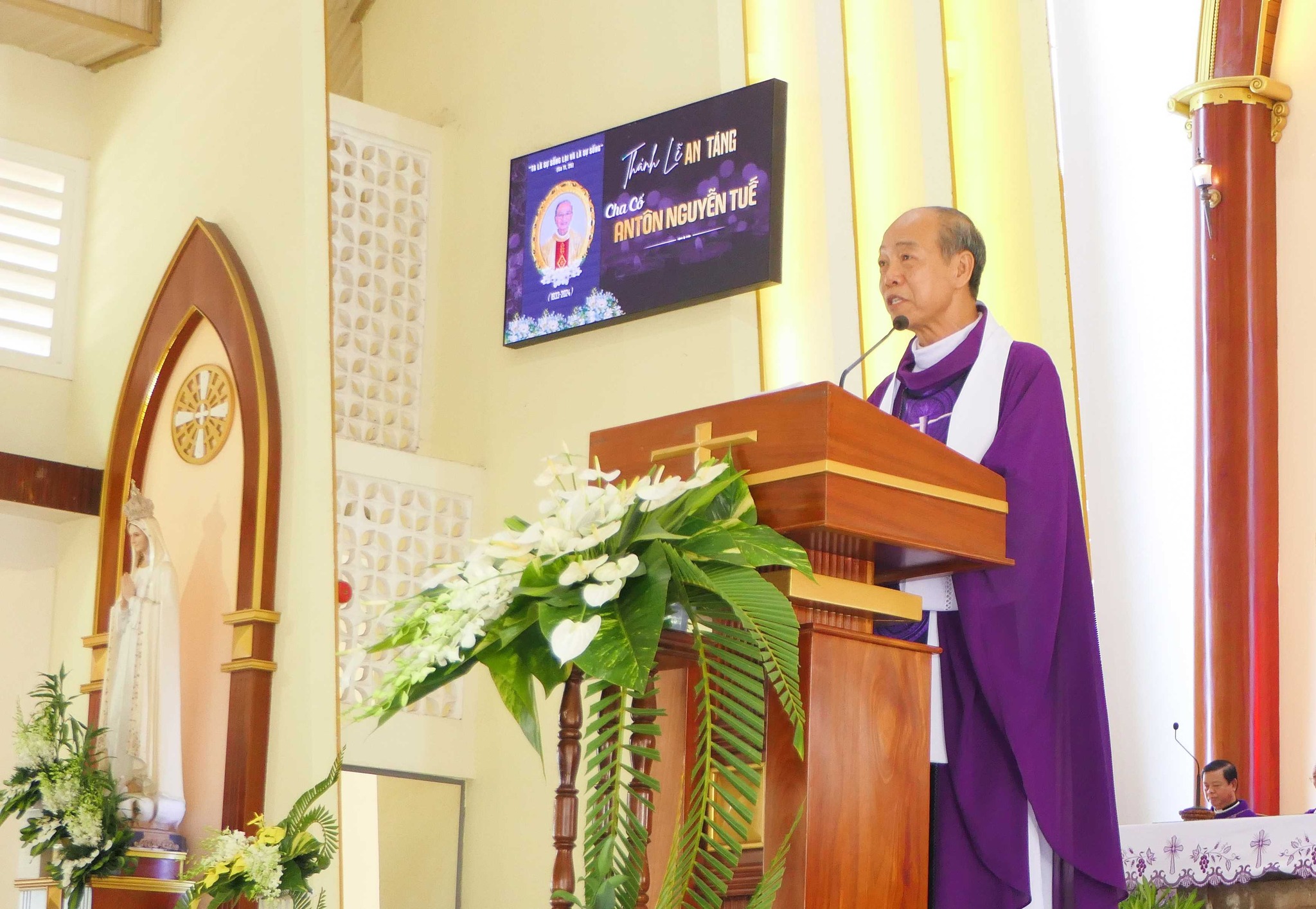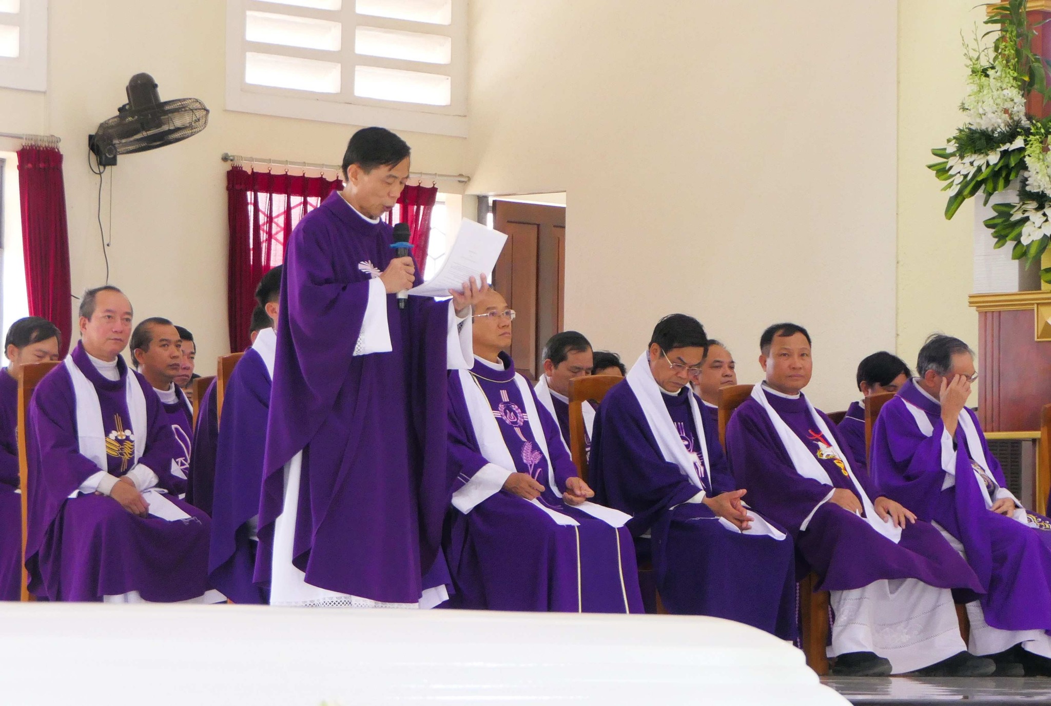 Trong bài giảng, cha Phaolô Nguyễn Trọng Xuân – Qh. Hoà Thanh đã chia sẻ với tư cách là con chiên của cha cố. Ngài dùng hình ảnh cái bay trong tay của người thợ xây để nói về hình ảnh của người linh mục. Người linh mục giống như chiếc bay trong bàn tay Thiên Chúa. Chúa dùng để xây dựng. Cha cố đã được mọi người kể và khoe về những công trình được cha cố xây dựng từ Gx. Định Quán rồi Gx. Phương Lâm và những công trình đó như dấu chỉ bên ngoài. Chúa muốn dùng cái bay là linh mục để xây dựng thành Giêrusalem thiên quốc, muốn xây dựng Nước Thiên Chúa ngay giữa trần gian. Chúa đã dùng cha cố trong suốt 62 năm linh mục ngay cả thời gian cha cố đã về hưu: 6 năm làm cha phó Phúc Nhạc, 1 năm Chánh xứ Tân Yên, 3 năm Chánh xứ Đại An, 18 năm Chánh xứ Định Quán, rồi 22 năm Chánh xứ Phương Lâm. Người ta chỉ thấy được những việc xây dựng bên ngoài, có mấy ai thấy được việc xây dựng các linh hồn mà ngài đã dày công. Trong suốt 62 năm, có biết bao nhiêu ngàn thánh lễ đã được ngài dâng để dân Chúa được nuôi dưỡng, có biết bao nhiêu ngàn người qua bàn tay ngài đã lãnh ơn của Bí tích Giải tội và các Bí tích khác. Với tài lợi khẩu, ngài đã lay động lòng người và giúp nhiều người được đụng chạm tới Lời Chúa. Cha cố đã là cái bay tốt lành được Chúa sử dụng để nhiều người được trở nên hoàn thiện hơn. Dù nóng tính nhưng cha cố vẫn là một người tốt bụng, ngài đã hết lòng vì Chúa và vì giáo dân. Cha quản hạt mời gọi cộng đoàn tiếp tục cầu nguyện cho cha cố.