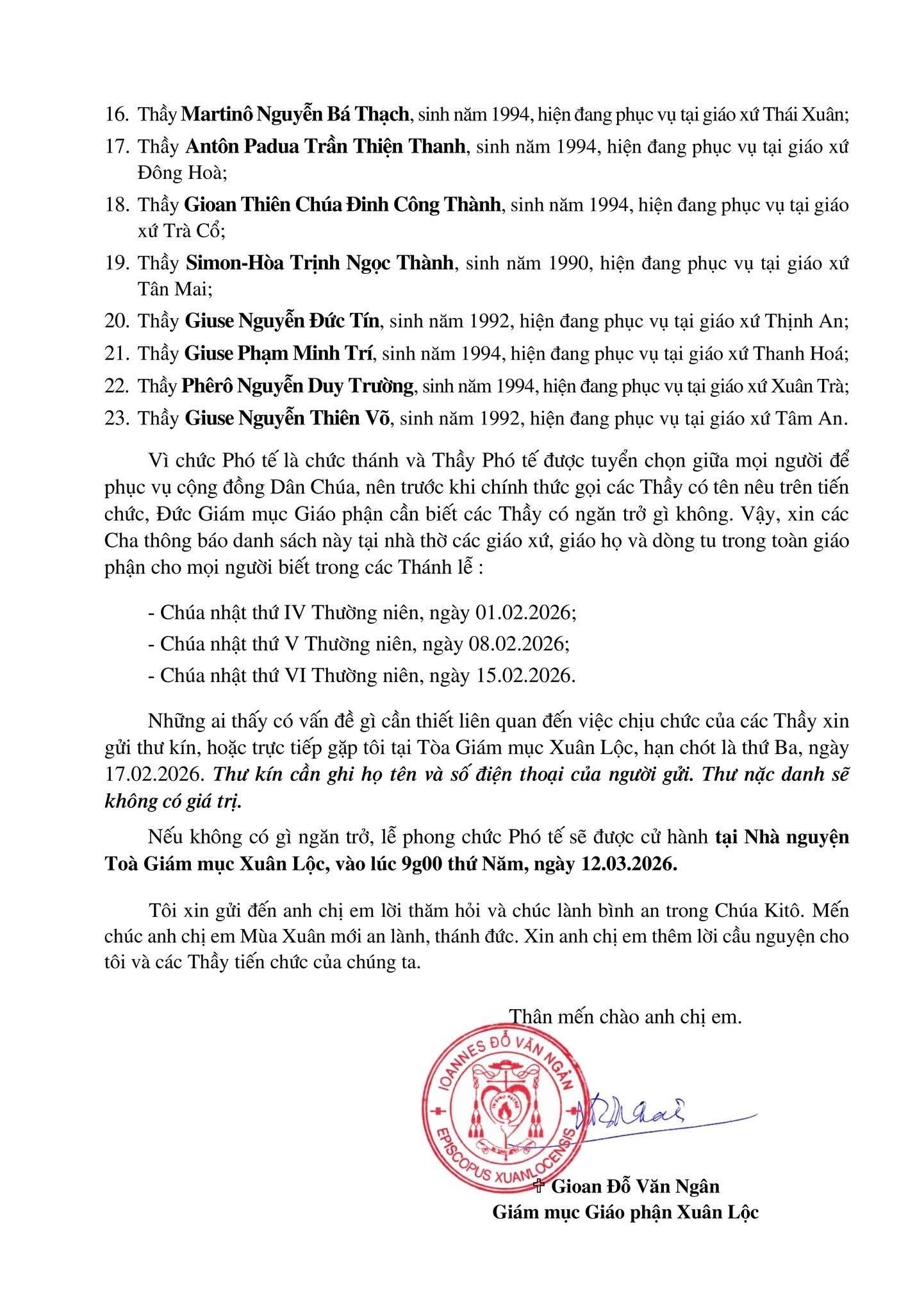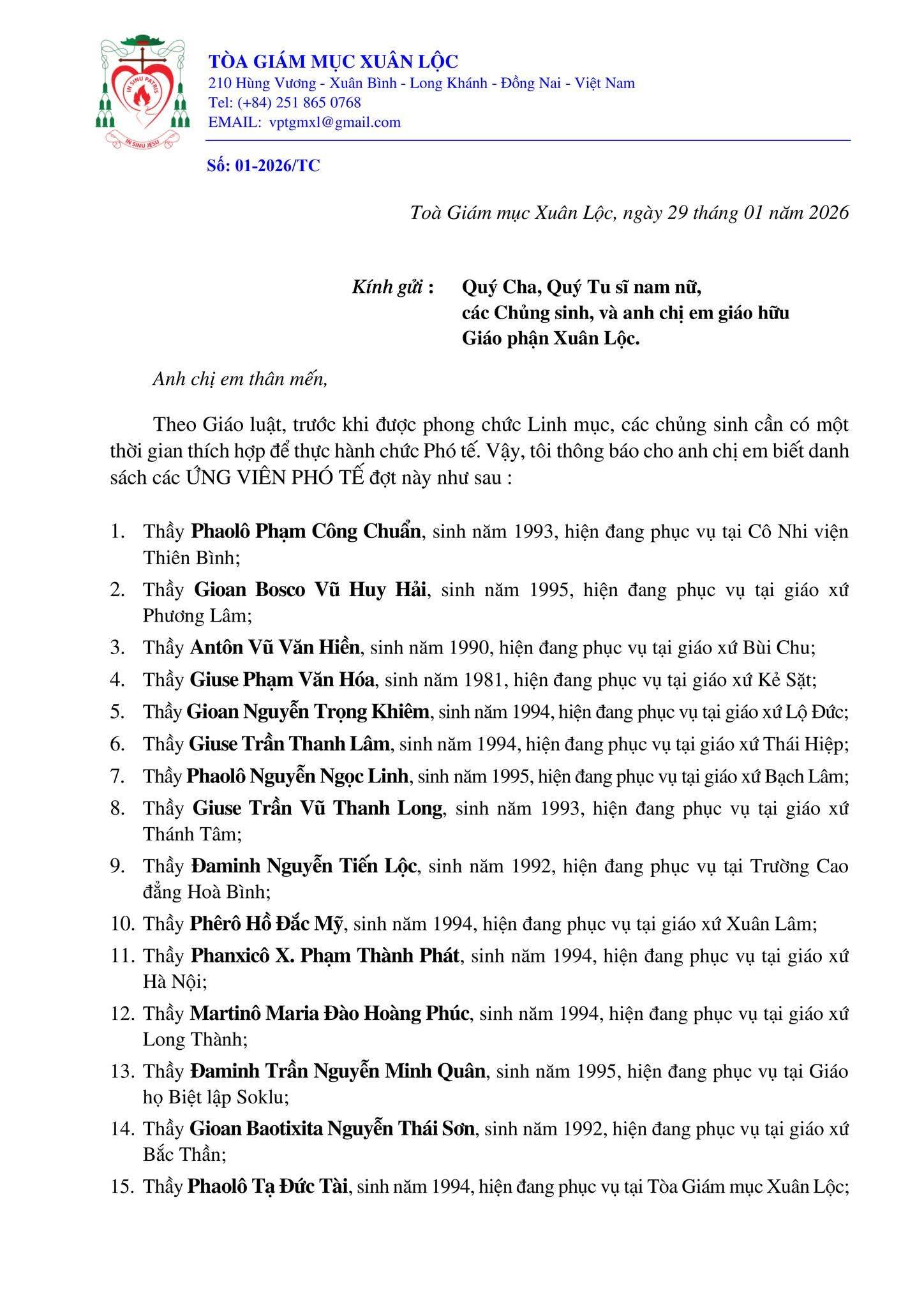 Theo Giáo luật, trước khi được phong chức Linh mục, các chủng sinh cần có một thời gian thích hợp để thực hành chức Phó tế. Vậy, tôi thông báo cho anh chị em biết danh sách các ỨNG VIÊN PHÓ TẾ đợt này