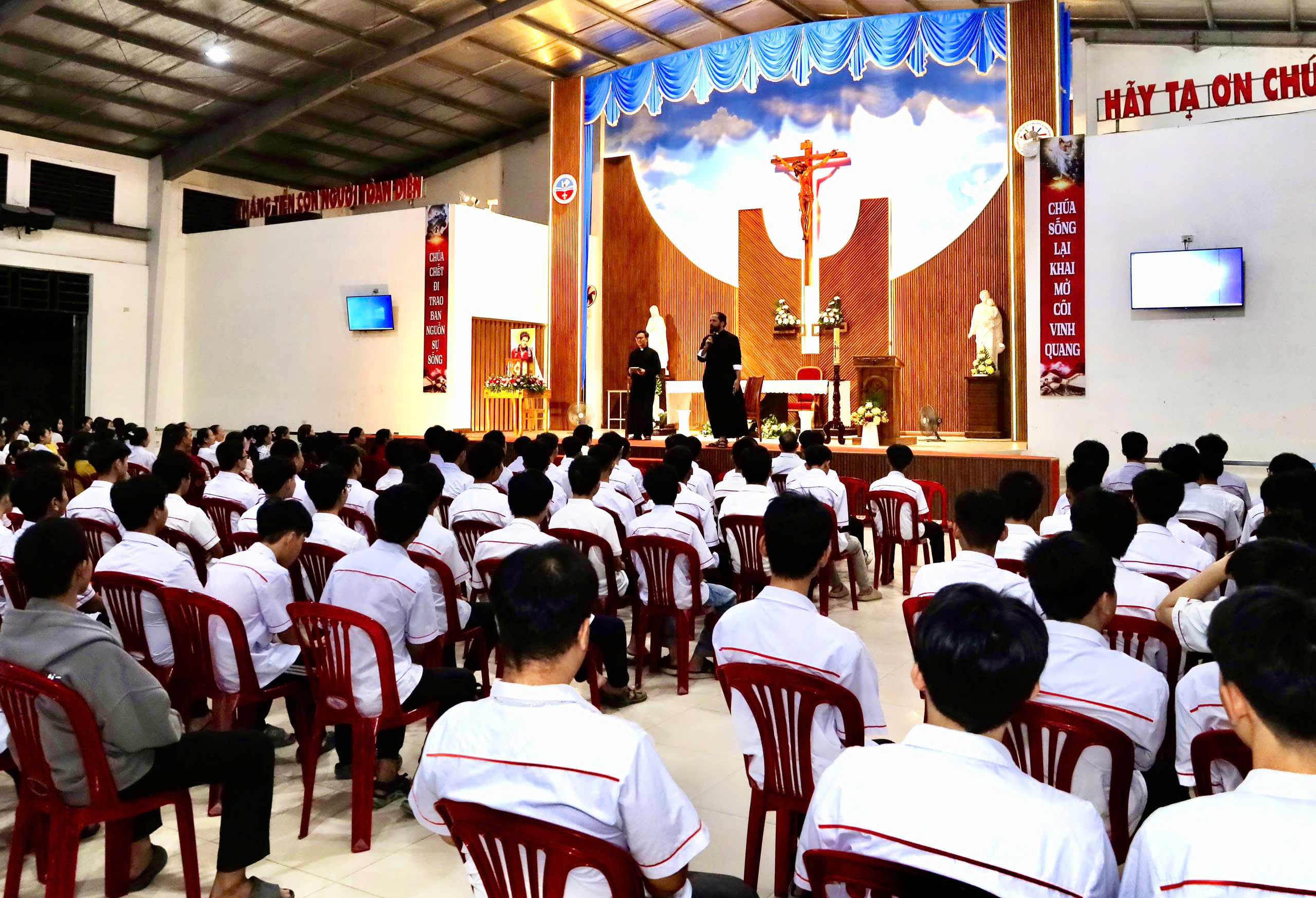 Chia sẻ trong phút khai mạc, Cha Hiệu trưởng Giuse Hà Đăng Định nói đến sự gần gũi của các thánh đối với cuộc đời người Kitô hữu. Ngài nhắc nhớ về ơn gọi nên thánh của mỗi người và mời gọi mọi người học theo nên thánh trong bổn phận của mình. Nhất là đối với Học sinh sinh viên, Cha Hiệu trưởng mời gọi các bạn noi gương thánh trẻ Carlo Acutis – cũng đam mê thể thao, cũng xài máy laptop, cũng sử dụng internet… nhưng biết quy hướng mọi sự: việc học, khả năng, đam mê, sở thích, việc làm… của đời mình về Chúa, yêu mến Thánh Thể Chúa.